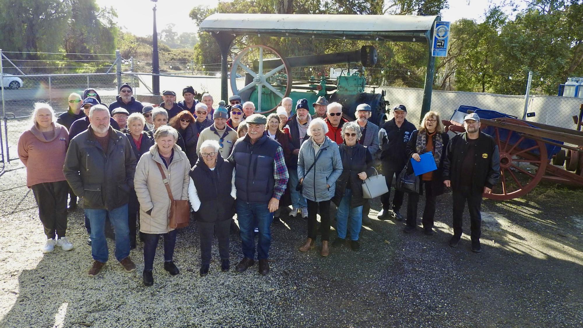 Upon arriving at the Maldon Machinery Museum, we were greeted by Vice President Rod Barry. Although it was sunny, a chilly wind met us. We took a group photo before exploring the impressive collection, which includes items like oil cans, saws, milk separators, and even a beautifully decorated white hearse. One highlight was a stunning circular display of woodworking hand tools.